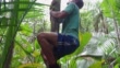 Worker climbing an acai palm tree, feet tied by an artisanal artifact known as "peconha", which helps him to reach the higher bunches to be cut - 4K stock video