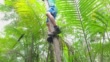 Worker climbing an acai palm tree, feet tied by an artisanal artifact known as "peconha", which helps him to reach the higher bunches to be cut - 4K stock video