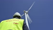 E.ON worker standing below wind turbine producing energy in Simrishamn, Sweden