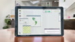 Animated, graphical home office on table. Emails, charts, graphs and everyday life are displayed on the screen over the course of a hard working day. Information icons and symbols come and go via the solid wi-fi connection. Info flies in and out of shot and in and out of the device. On a lovely sunny day.