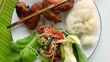 World-famous Thai spicy papaya salad with freshwater crab served with grilled chicken and sticky rice. - 4K stock video