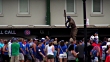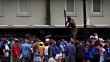 Fans gather around the bronze statue of Hall Of Fame Cubs player, Ernie Banks, just before an afternoon Cubs game