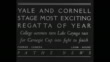 Title card: "Yale And Cornell Stage Most Exciting Regatta of Year - College oarsmen turn Lake Cayuga race for Carnegie Cup into fight to finish" / VS rowing shells race across water, other leisure boats in water; cutaways of crowd watching from shore seen from passing boat
