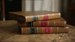 Literature: 200 years since Jane Austen's Pride and Prejudice published; ENGLAND:INTTILT DOWN Bookshelf with Jane Austen books displayed Pride and Predjudice volumes I, II and II Close shot books in pile on table Books in pile and ink quill on table