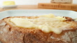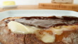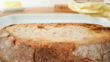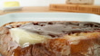 A close up clip of butter and yeast extract being spread over a slice of sourdough toast. Shot on a clean porcelain plate, with a wooden bread board and small butter dish in the background.