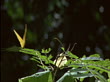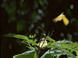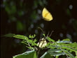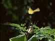 Yellow butterfly flies over and dive-bombs second one perched on foliage (Core Number: NBRY513A)