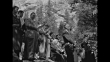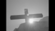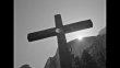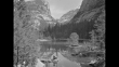 Title card: "Yosemite" superimposed over beauty shot Yosemite Falls, with trees in foreground / tilt-up shot wooden cross, with sun peering over mountain in background / WS Yosemite Falls, bracketed by trees / tilt-up shot wooden cross, with sun a little higher on the horizon / WS mountains and trees; tilt down to WS Mirror Lake, with clergyman standing with cross on a rock in the lake in the middle ground, conducting an Easter service; attendees in foreground, standing and seated on rocks, facing away from camera and toward pastor / MS reflection of cross in lake water / standing people listen / people seated on rocks listen