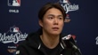 LOS ANGELES, CALIFORNIA - OCTOBER 29: (INTERVIEW) Yoshinobu Yamamoto #18 of the Los Angeles Dodgers speaks about throwing his bullpen before the game and feeling healthy while Yoshihiro Sonoda interprets off camera after Game Five of the 2025 World Series between the Toronto Blue Jays and the Los Angeles Dodgers at Dodger Stadium on October 29, 2025 in Los Angeles, California. (Footage by Lucas Mayer/Getty Images)
