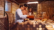 SLO MO - Medium shot of young adults attentively engaging in a traditional craft workshop with an instructor. The setting includes various wooden tools and materials, highlighting the intricate process of learning mashrabiya inlay techniques.