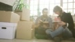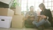 Young couple sitting in new apartment around unpacked boxes - 4K stock video