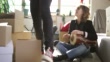 Young couple sitting in new home around unpacked boxes - 4K stock video
