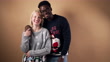 Portrait of funny young diverse couple wearing ugly Christmas sweaters. Young couple celebrating Christmas with matching Christmas sweaters