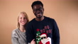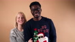 Portrait of funny young diverse couple wearing ugly Christmas sweaters. Young couple celebrating Christmas with matching Christmas sweaters