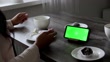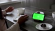 A young, dark-skinned plus size girl eats a sweet dessert and drinks coffee from a white mug with a green smartphone screen. - HD stock video