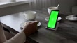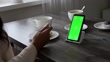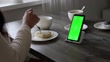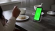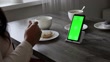 A young, dark-skinned plus size girl eats a sweet dessert and drinks coffee from a white mug with a green smartphone screen. - HD stock video