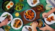 Young family having lunch at home. On the table are seafood,grilled salmon, couscous, grilled shrimp, asparagus with eggs and salad