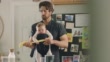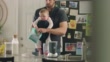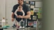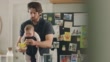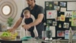 Young father prepares healthy fruit smoothie in kitchen while baby watches from front facing carrier. - 4K stock video