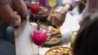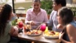 Young gay couple eating while talking with their friends at rooftop