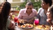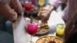 Young gay couple eating while talking with their friends at rooftop - 4K stock video