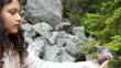 Young girl feeds Canada Jay (Whiskeyjack) from hand - 4K stock video