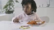 HH MCU shot of little black girl sitting at table eating chicken fingers and colouring.