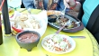 Young adult Hispanic woman smiling while sharing faijitas with her senior grandmother during a meal at a Tex-Mex or Mexican cuisine restaurant. Women are enjoying meal outdoors on brightly colored patio on sunny day. Other customers are eating in background.