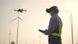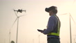 Young Male engineer controlling flying by VR glasses drone working at wind power station at Subset - 4K stock video