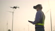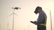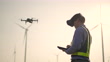 Engineer,Drone,Flying,Construction Industry,Construction Site,Surveyor,Technology, Young Male engineer controlling flying by VR glasses drone working at wind power station at Subset