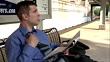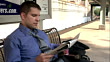 Young male professional reading newspaper and loosening tie on bench at train station - HD stock video