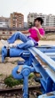 Dynamic young man wearing casual jeans and t-shirt dancing energetically while sitting on blue railway equipment with urban background highlighting youthful creativity and joy