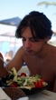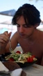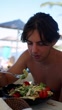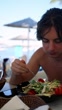Young Man Enjoying a Fresh Salad at a Beachside Restaurant - 4K stock video