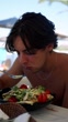 Young shirtless man, seated at a beautifully set table near the sea, taking a bite of his fresh salad