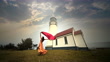 Young woman dancing in wind near Cape Blanco Lighthouse, Oregon
