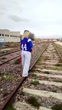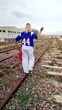Youthful dancer in blue sports jersey performing expressive movement on abandoned railroad tracks, embodying freedom and artistic passion amid industrial landscape