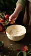 Woman dressed in vintage clothing makes apple galette.