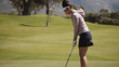 Slow motion shot of young woman preparing for shot while playing golf on golf course