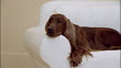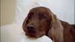 Zoom in on Irish setter resting head on armrest of chair and looking at camera - HD stock video