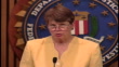 MCU Zoom-in Washington DC State Department Assistant Secretary for Diplomatic Security Janet Reno speaks at a press conference held in 1999 after Osama Bin Laden bombed two US embassies. He was at this time added to the FBIs Top 10 wanted fugitive list. Janet Reno states, "Though the placement of Bin Laden and Kopp on the top 10 list is coincidental both men believe their views entitle them to use all means including violence to achieve their goals. Our message is that that is wrong, simply wrong, their goals do not justify murder."