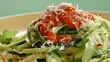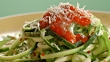 CU zucchini pasta on rotating dinner plate as marinara sauce is poured over the top and parmesan cheese sprinkled over the hot marinara - HD stock video